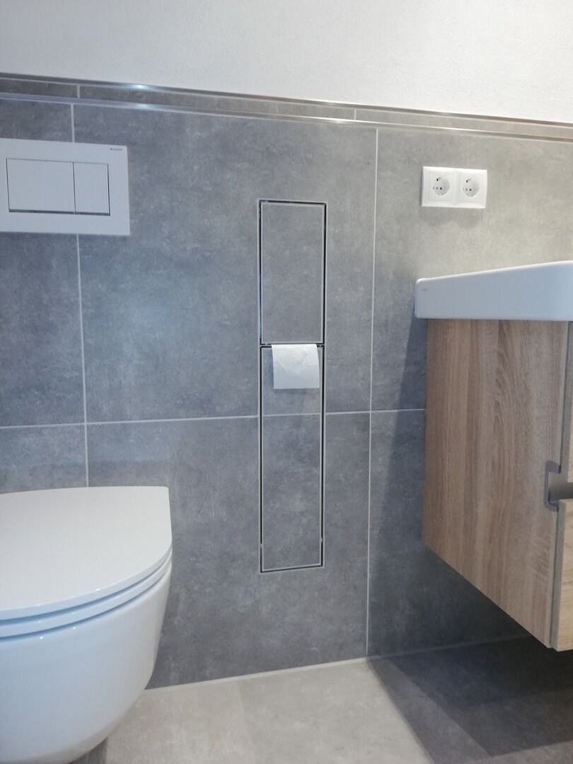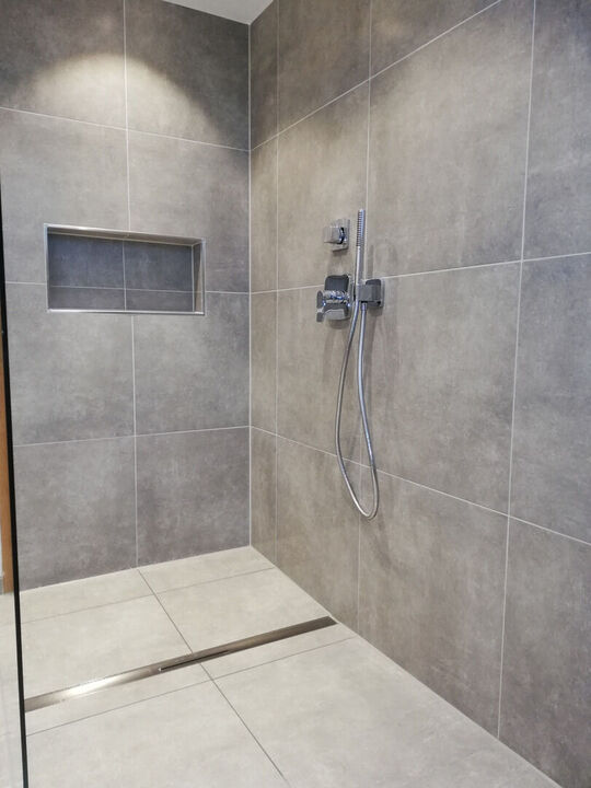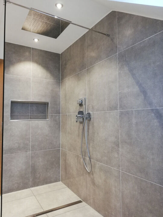 Machen Sie Ihr Badezimmer zu einem Ort der Entspannung mit einer geräumigen, bodenebenen Walk-In Dusche und einer praktischen Deckeneinbau-Kopfbrause. Das WC ist mit einem Einwurfschacht für Reinigungstabletten ausgestattet, so wird die Pflege vereinfacht. Der flächenbündige Toilettenpapierspender fügt sich perfekt ins moderne Design ein.